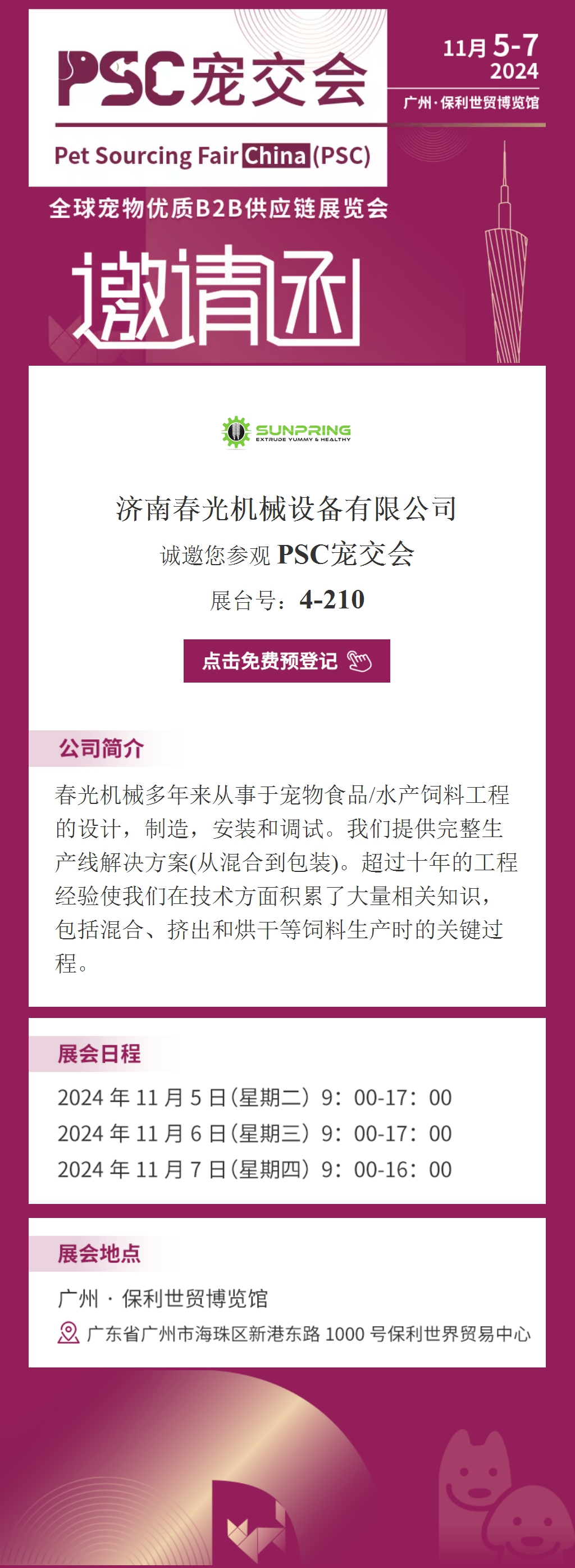 您現(xiàn)在的位置:首頁> 新聞中心 > 新聞中(zhōng)心 >> 展會信息 >> 濟南seyu9久機械設備有限公司 誠(chéng)邀您參觀 PSC寵交會