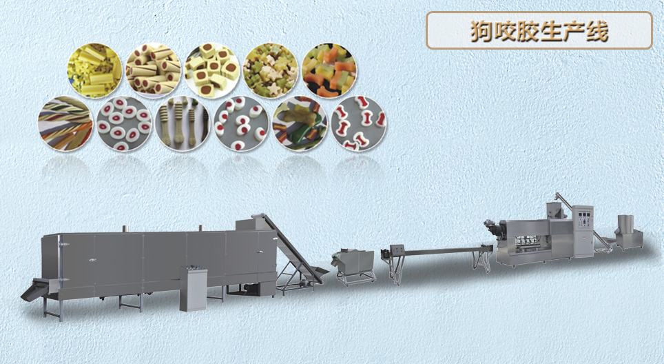 寵物咬膠生產線是專門用於生產狗咬膠係列產品,經過(guò)單螺杆擠出機擠出,該生產線可生產條狀、棒(bàng)狀、麻花狀、雙色及多色(sè)形狀各(gè)異的(de)寵物咬膠。愛犬咀嚼過程中,適度對愛犬(quǎn)的牙齒進行按摩,同時促進愛犬(quǎn)分泌唾液,幫助提高其消化功能。天然食物製造(zào),耐磨損,無毒無害。磨牙、補充營(yíng)養。